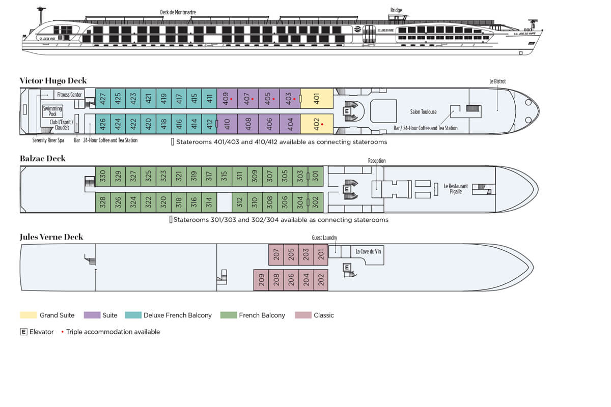 The S.S. Joie de Vivre - is designed to reflect the “joy of living” as it cruises along the Seine River in northern France. This luxurious 128-passenger vessel features handcrafted furniture, sumptuous fabrics, beautiful antiques, gilded accents and every modern convenience. The Salon de Beaux-Arts Lounge will showcase a collection of fine art and antiques curated from renowned auction houses and private collections. The Le Club l’Esprit has a pool that can ingeniously transform into a dance floor or an outdoor cinema at night.