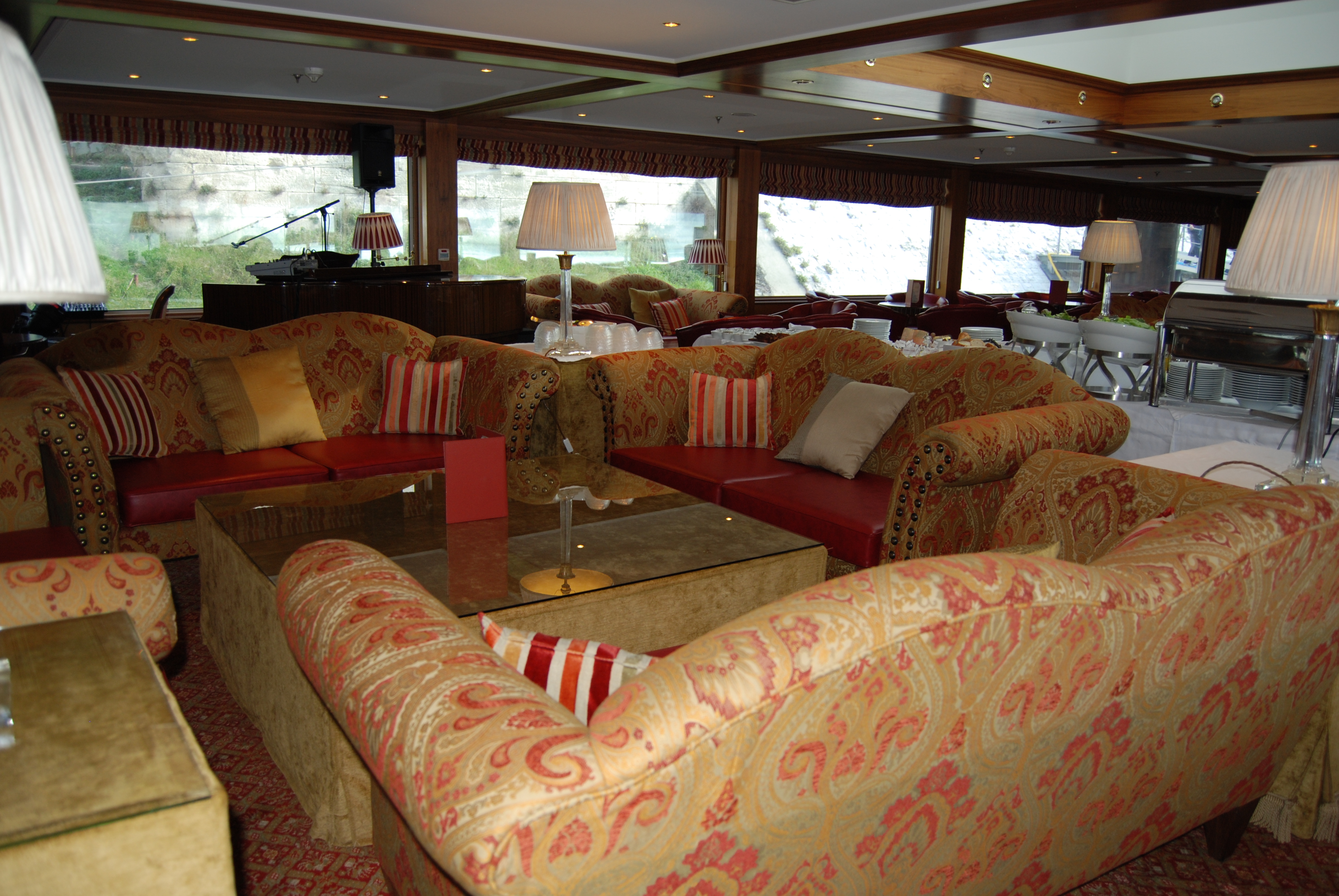 - Beautiful panoramic main lounge with full-service bar, cozy library, elegant restaurant, sun deck with chess and shuffleboard, fitness room, sauna, Jacuzzi, massage treatments, gift boutique, and elevator